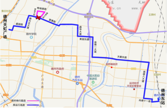 运营路线:德州东站、崇德十大道、尚德十一路、崇德八大道、天衢路、崇德一大道、果园路、晶华大道、红都路、萱蕙路、德贤大街、格瑞德路、育英大街、萱蕙路、德兴大道、盛园路、湖滨大道、德州天虹广场;
