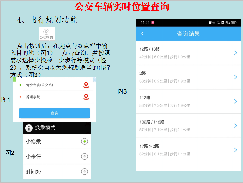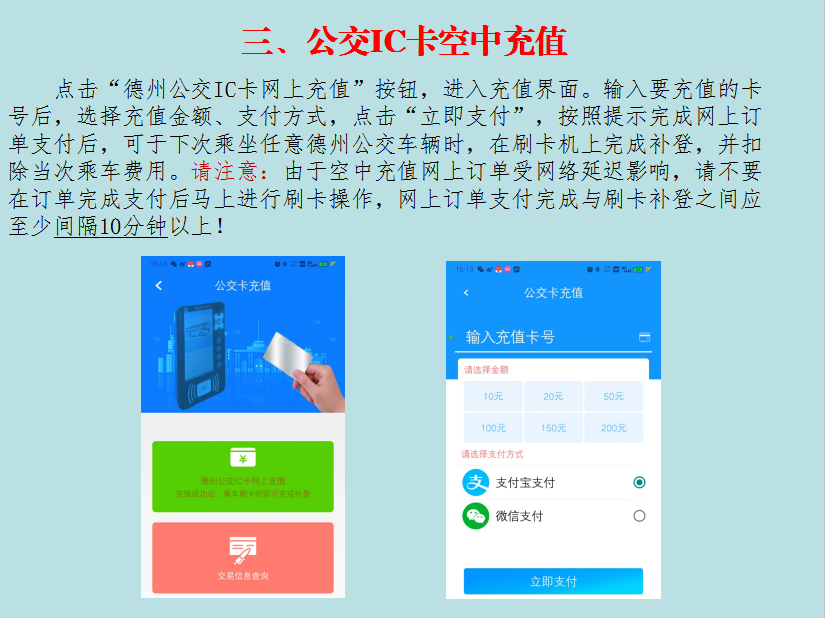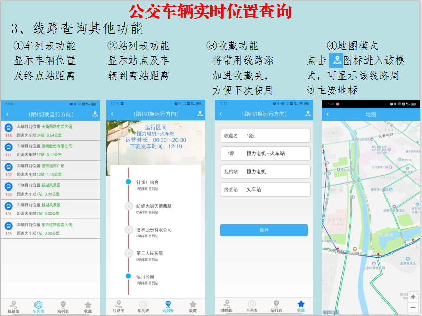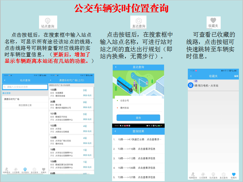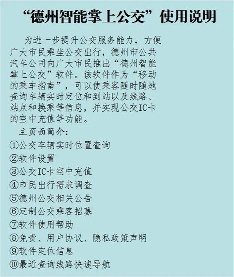 “德州智能掌上公交”APP可进行线路查询、公交卡充值、车辆实时位置、换乘信息、站点查询等功能,具体操作步骤如下:
