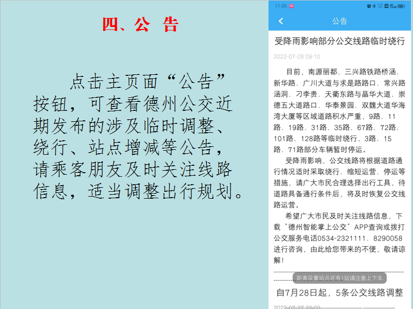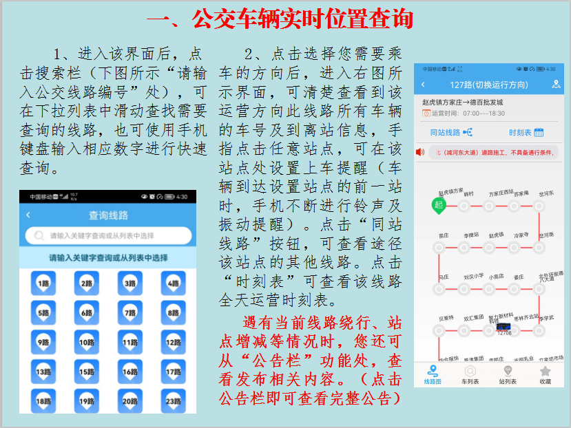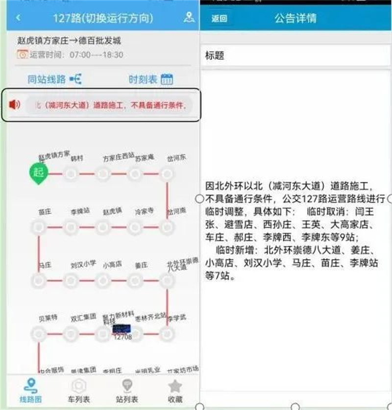 同时,在车辆实时位置显示界面,增加“公告栏”显示功能,遇有当前线路绕行、站点增减等情况时,公告栏中发布相关内容。点击公告栏即可查看完整公告。
