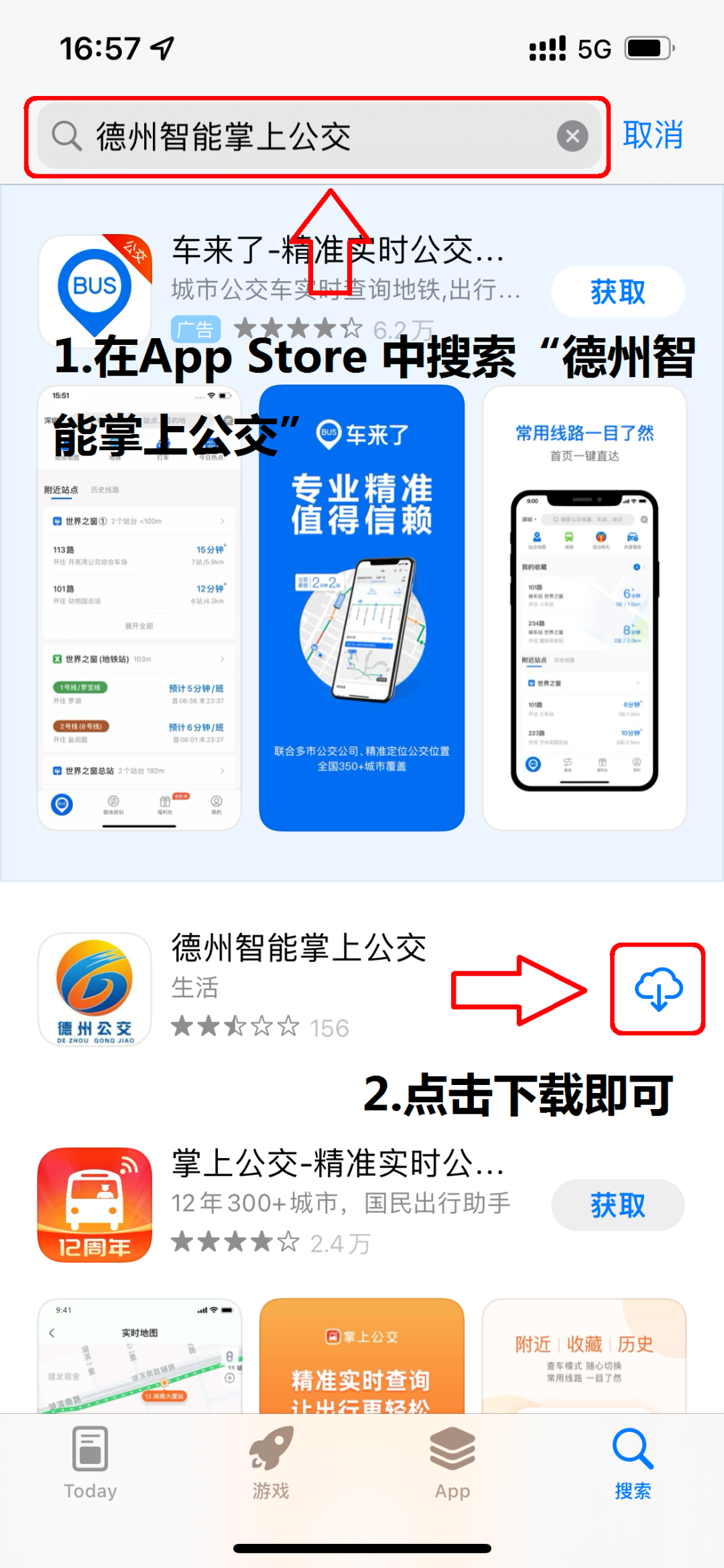 2.苹果手机在App Store中搜索并安装“德州智能掌上公交”。
