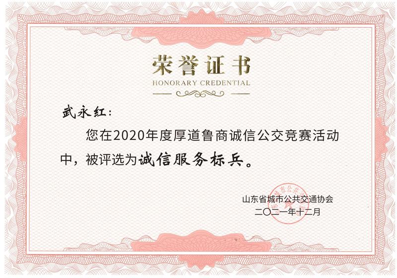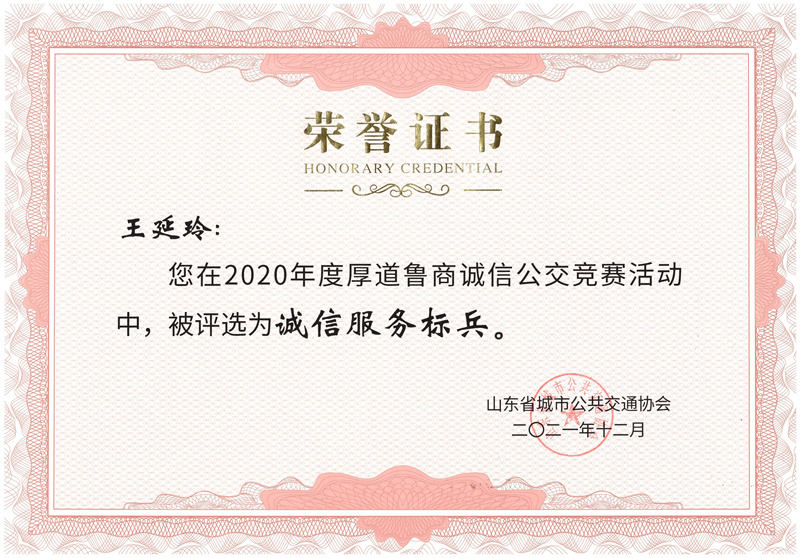 王延玲、武永红荣获2020年度厚道鲁商诚信公交竞赛活动“诚信服务标兵”称号