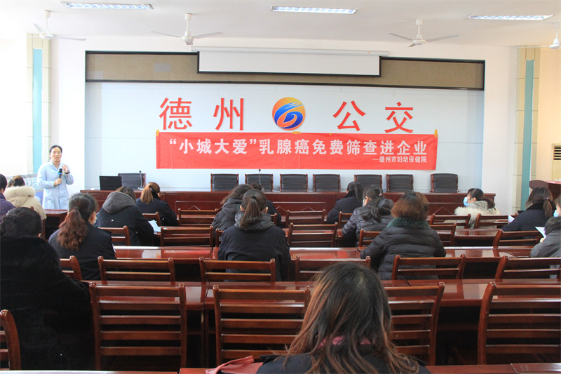 进一步增强基层职工健康意识和预防疾病能力,提高妇女乳腺症筛查率,确保女职工身心健康,公司积极争取上级支持,1月11日,市总工会联合市妇联和市妇幼保健院走进德州公交,开展为期两期的“大城小爱”乳腺癌免费筛查活动。特邀德州市妇幼保健院乳腺科主任、副主任医师徐敏玲教授现场讲解疾病预防知识讲座。