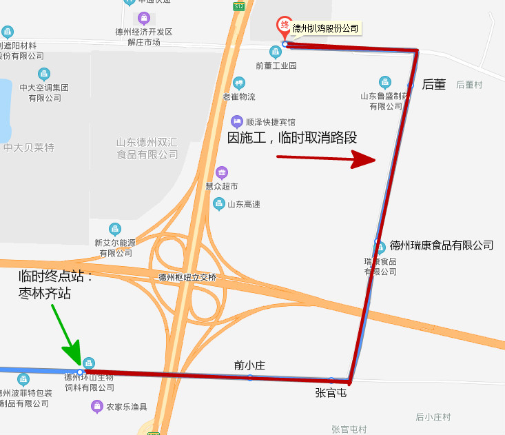 临时将枣林齐站调整为终点站,临时取消前小庄、张官屯、德州瑞康食品有限公司、后董、德州扒鸡股份公司站点。