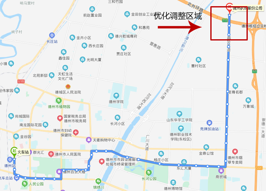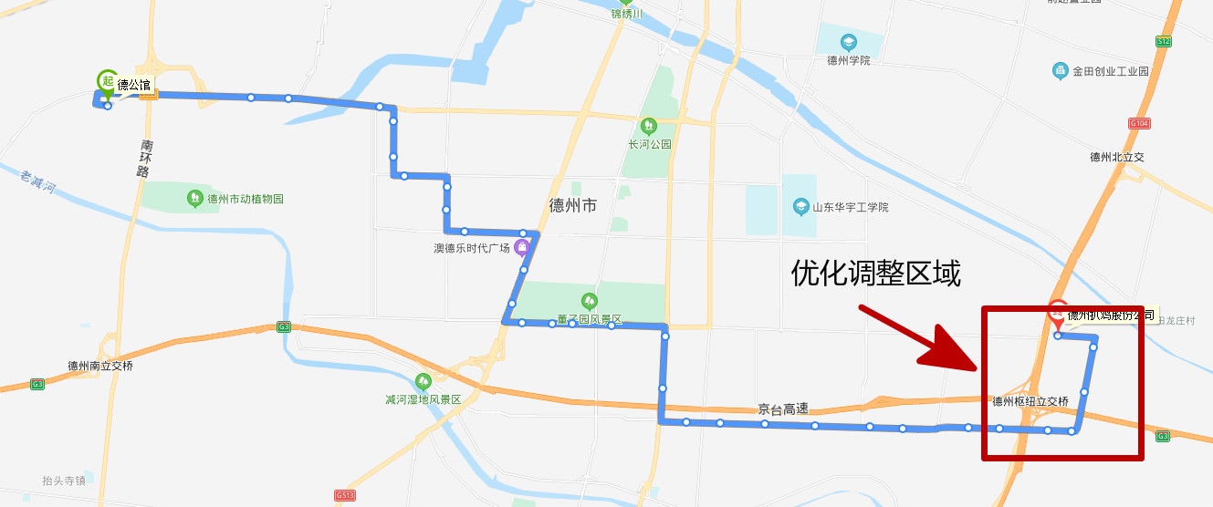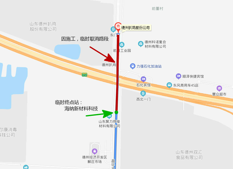 临时将海纳新科技站调整为终点站,临时取消德州扒鸡股份公司终点站,其他线路站点没有变化。