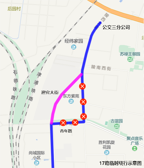 因青年路(迎宾大街至陵西路路段)道路施工,即日起,17路临时绕行,39路在原绕行基础上临时绕行,具体如下: