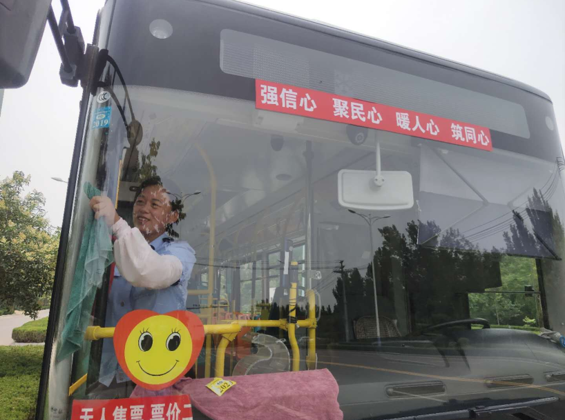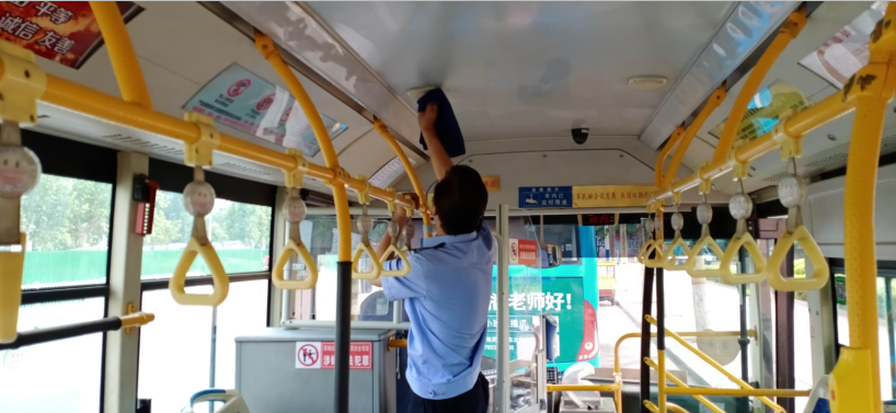 公交车驾驶员利用休息及发车前间隙,全面细致清洁车辆、清理车厢卫生死角、清洗空调滤网并扎实做好防疫消毒,保障乘客出行环境更洁净、更卫生、更舒适,擦亮公交车这一道城市流动的风景线。