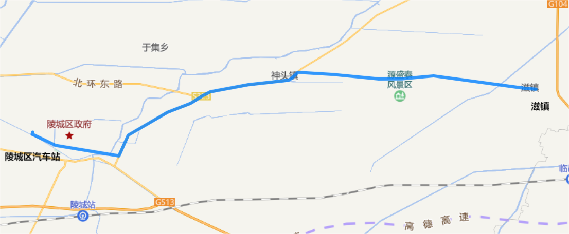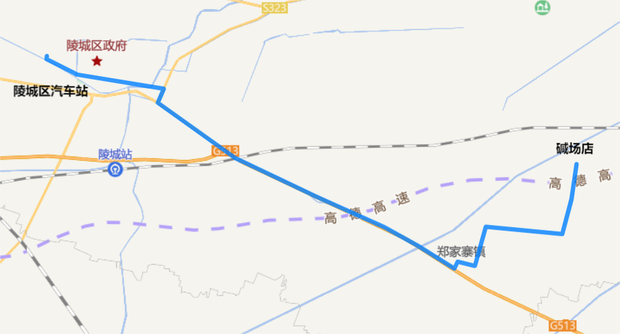 运营路线:陵城区汽车站、陵州路、东环北大街、G513、民丰路、郑丰路、家丰路、后李村、碱场店,返程亦同;