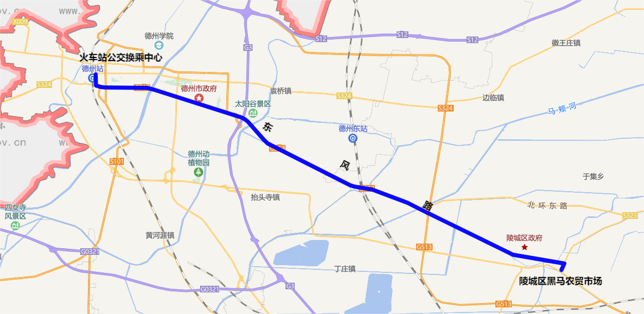 运营路线:德州东站、崇德十大道、马颊河路、福星街、陵州东路、东环南大街、陵城区黑马农贸市场,返程亦同;