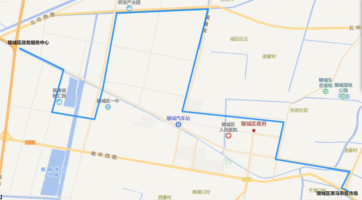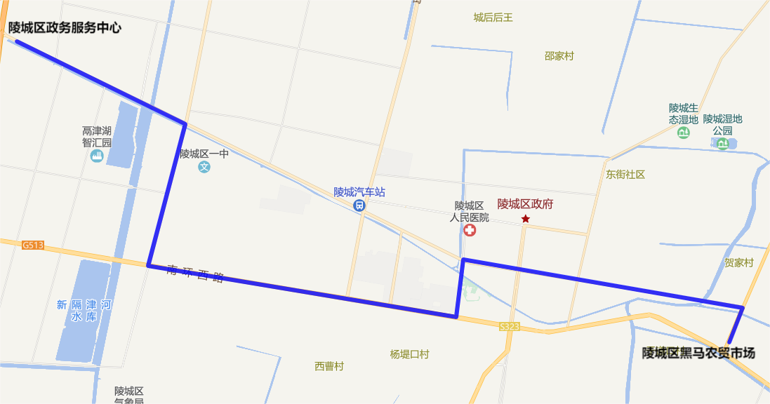 运营路线:陵城区政务服务中心、陵州路、迎宾北大街、北环西路、陵边路、唐城路、威灵街、陵州路、东环北大街、陵城区黑马农贸市场,返程亦同;