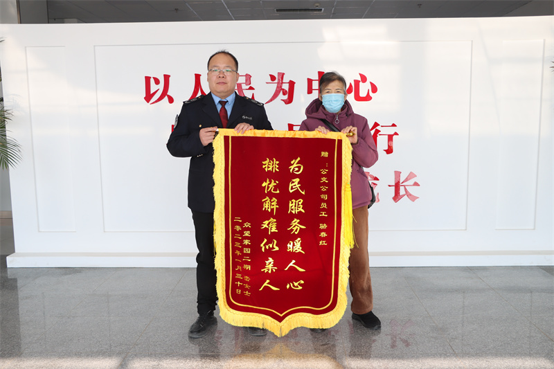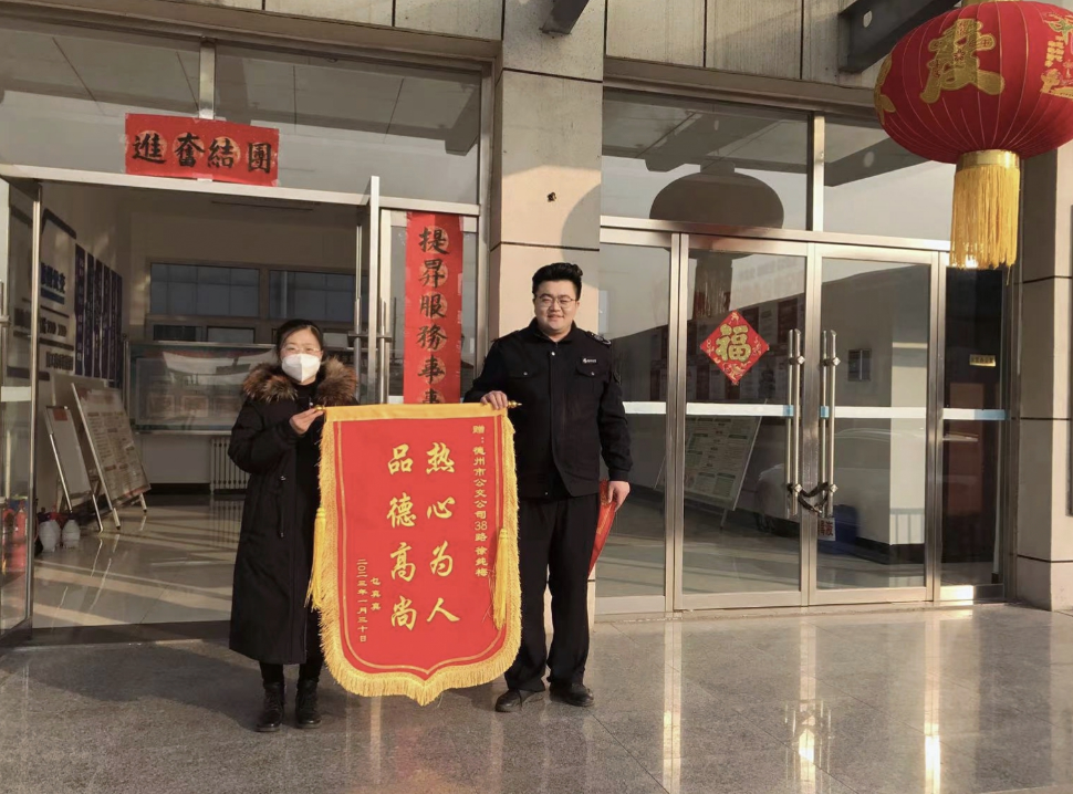 同日下午,乘客乜女士来到营运二分公司,赞扬和感谢38路班长徐纯梅具有热心助人的高尚品质,为徐纯梅送上印有“热心为人 品德高尚”的锦旗。同时也对公交培养了高素质、高觉悟的员工进行感谢。