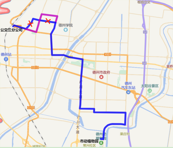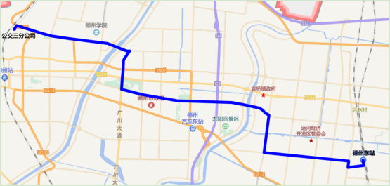 运营路线:公交三分公司、陵西路、大学西路、广川大道、东方红东路、崇德三大道、尚德十一路、崇德十大道、德州东站,返程亦同;
