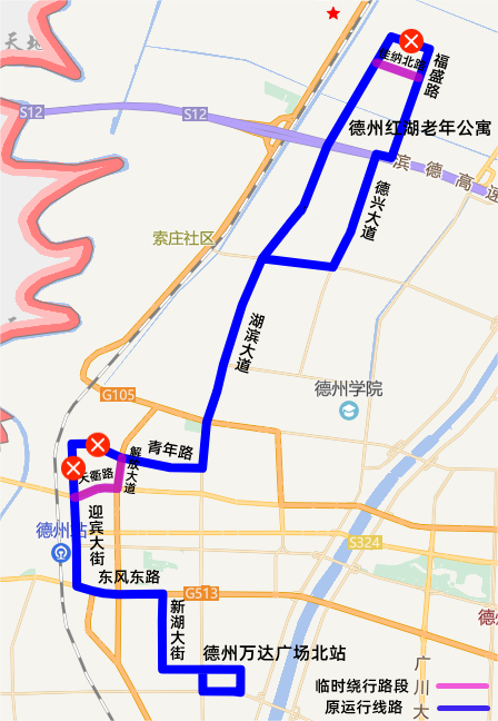 运营路线:德州红湖老年公寓、德兴大道、萱蕙路、湖滨大道、青年路、解放大道、天衢路、迎宾大街、东风路、新湖大街、新建路、德州万达广场北站;