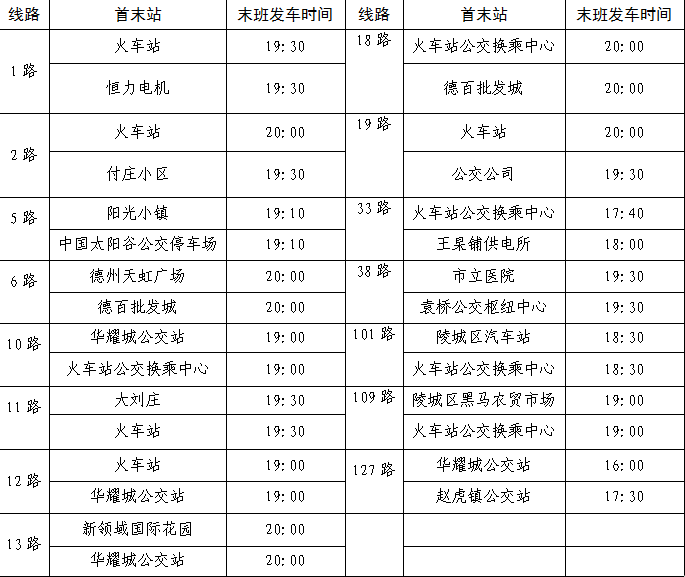 以上线路末班发车时间调整后,除127路首班发车时间调整为华耀城公交站7:00、赵虎镇公交站8:30外,其余线路首班发车时间保持不变。