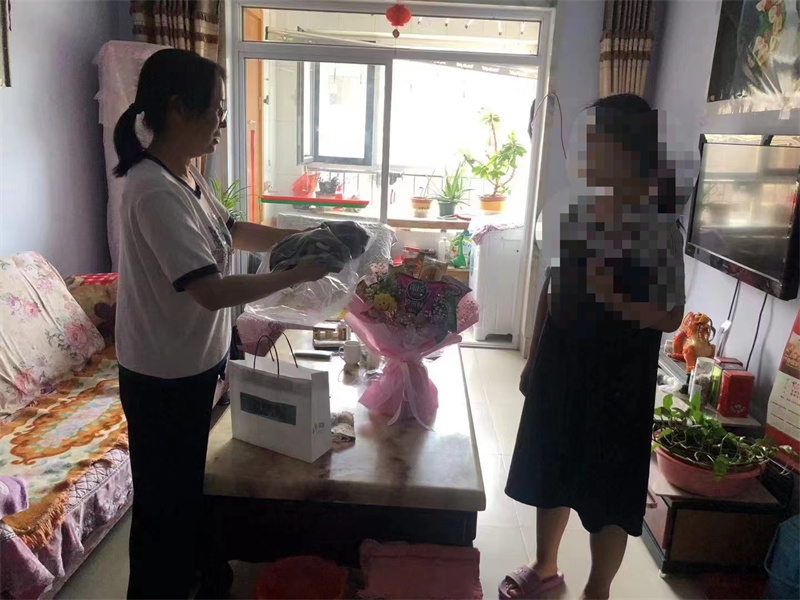 2路“爱心妈妈”们来到于西结对家庭为姊妹俩送去节日礼物--一人一套新衣服和水果,孩子露出了开心的笑容并对“妈妈”们表示了感谢。