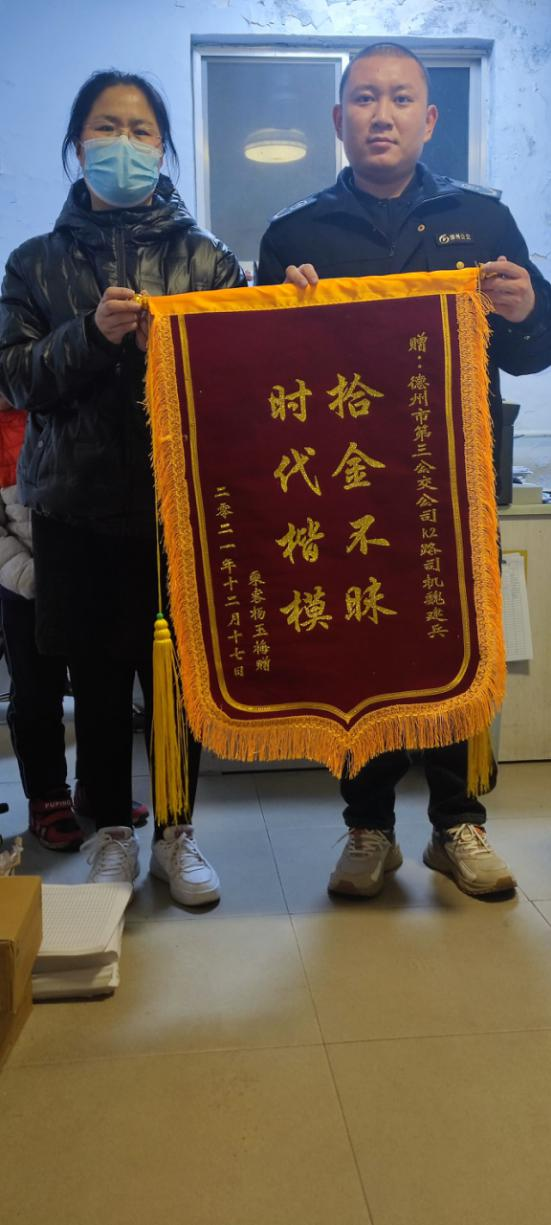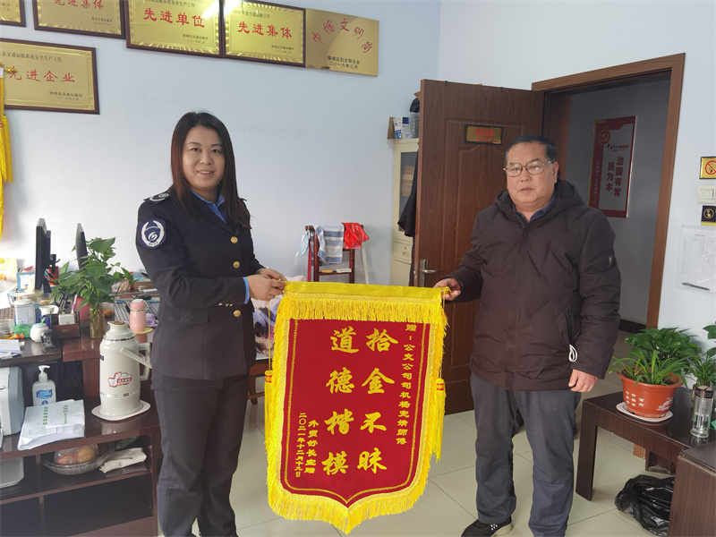 12月22日,市民舒先生专程来到陵城区东方城乡公交有限公司综合办公室,把一面印有“道德楷模、拾金不昧”的红色锦旗交到车长杨宪婧师傅手中,感谢杨师傅为他找回新买的手机。拿到失而复得的手机失主无比激动,对德州公交人拾金不昧的高尚品德加以赞赏。
