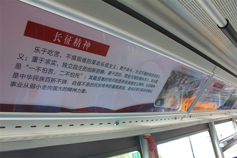 走进“红色公交”,它以中国红为主色调,以公交车身、车内座位、车内把手等为载体,围绕建党100周年的主题,把党旗、党徽、建党100周年标识等元素融入到“不忘初心跟党走 同心共筑中国梦”、“青春心向党 建功新时代”等宣传标语和“沂蒙精神”、“红船精神”等红色精神中进行设计构造,将党的红色基因、红色精神以及风雨兼程的光辉历史娓娓道来。“红色公交”宛如历史的见证者,讲述着一段又一段党的光辉事迹,让市民在乘车途中接受红色文化的洗礼和熏陶。