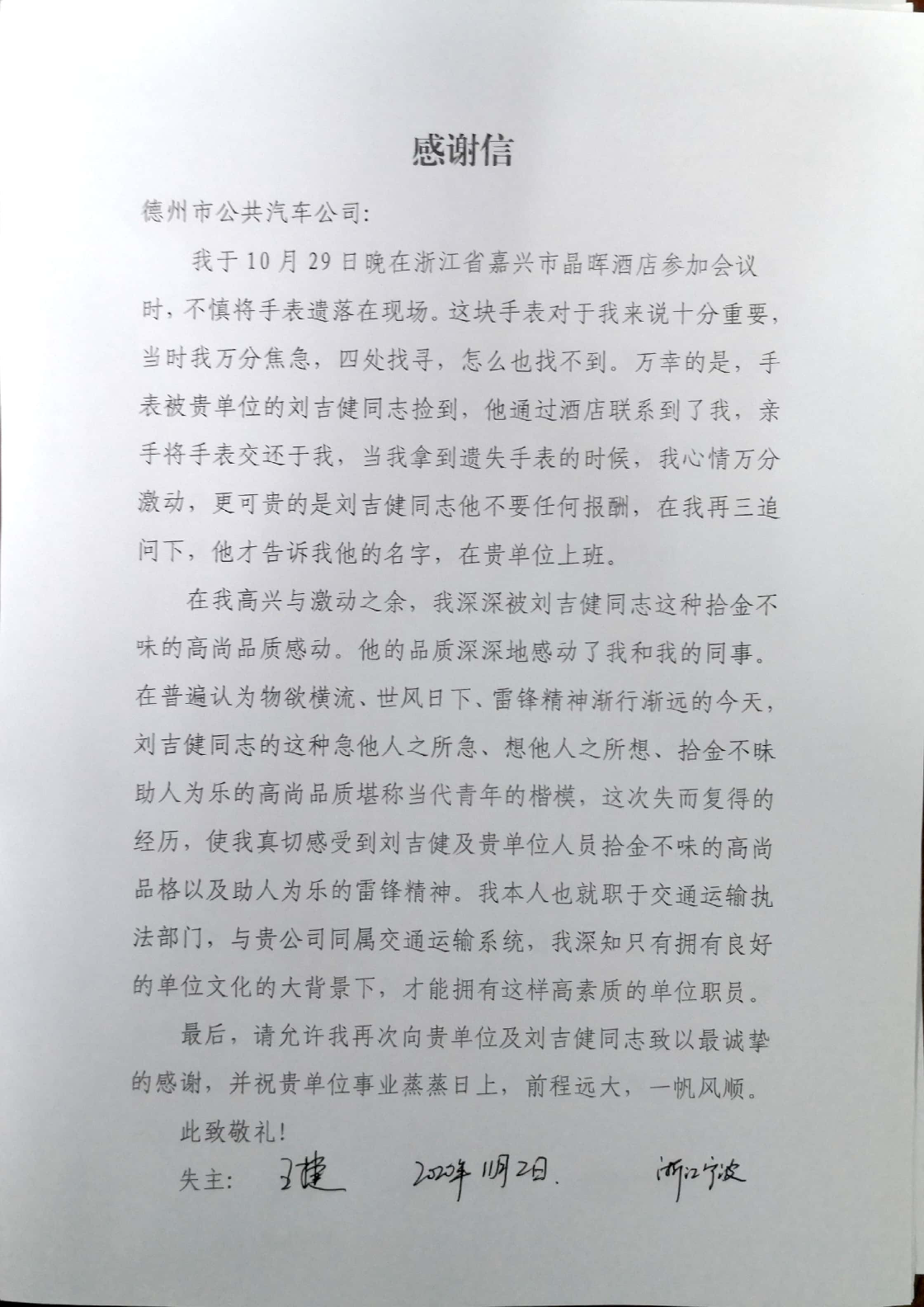 从德州到宁波,距离长达1000余公里,一南一北两座城市的人,却因一次拾金不昧拉近了距离,11月2日,公司收到来自宁波市民的一封感谢信,这份千里迢迢发来的感谢信寄托了一份对公交职工拾金不昧的精神褒奖。