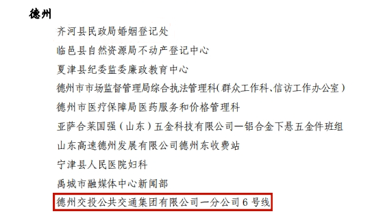 近日,山东省妇联印发《山东省妇联关于命名省巾帼文明岗的通知》,我市共有10个集体岗组被命名为“山东省巾帼文明岗”,德州交投公共交通集团有限公司一分公司6号线光荣上榜!