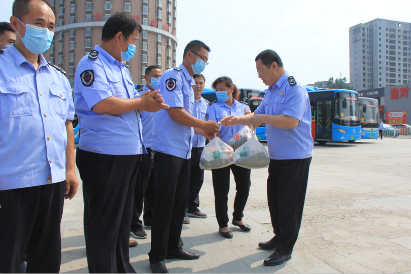 骄阳似火,酷暑难当,随着聒噪的蝉鸣,又迎来了今年的高温季节。为做好防暑降温工作,保障公司职工身体健康,7月17日,公司党委书记、经理马军,副经理孙培功,工会主席孙维健分组来到各公交场站,为奋战在一线的职工送去了绿豆、白糖、矿泉水等防暑降温物品,也送上了一份诚挚的关怀。