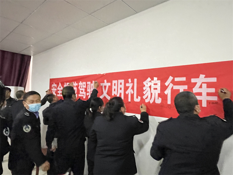三、营造浓厚活动氛围。驾驶员代表宣读倡议书,全体车长联合在倡议条幅上签字。