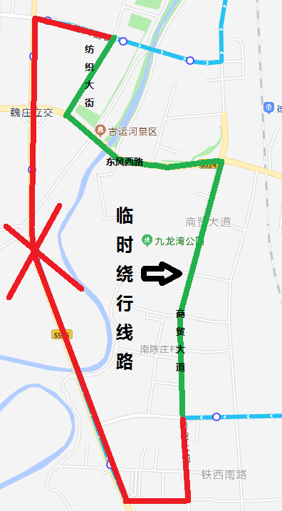 因运河大道高架桥封闭施工,自2021年7月10日起,公交线路39路临时绕行,具体绕行线路如下: