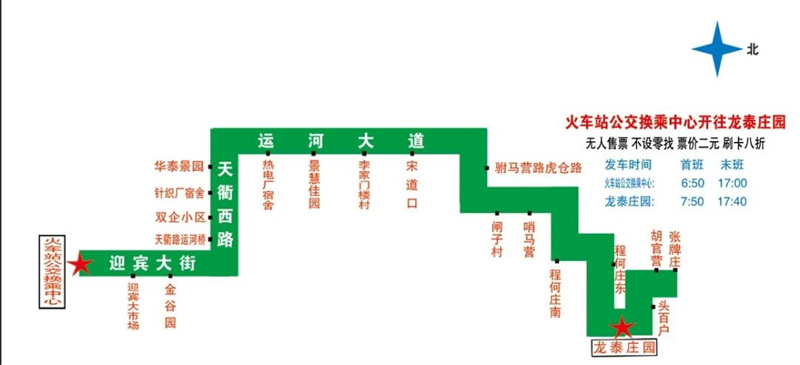 运营路线:火车站公交换乘中心、迎宾大街、天衢路、运河大道、驸马营路、虎仓路、龙泰庄园,返程亦同;