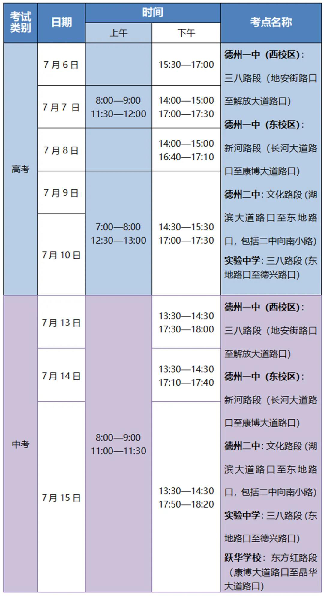 2020年普通高校招生考试(夏季)于7月7日至10日进行,考点设在德州一中(西校区)、德州一中(东校区)、德州二中、实验中学;初中学业水平考试(中考)于7月13日至15日进行,考点设在德州一中(西校区)、德州一中(东校区)、德州二中、实验中学、跃华学校。