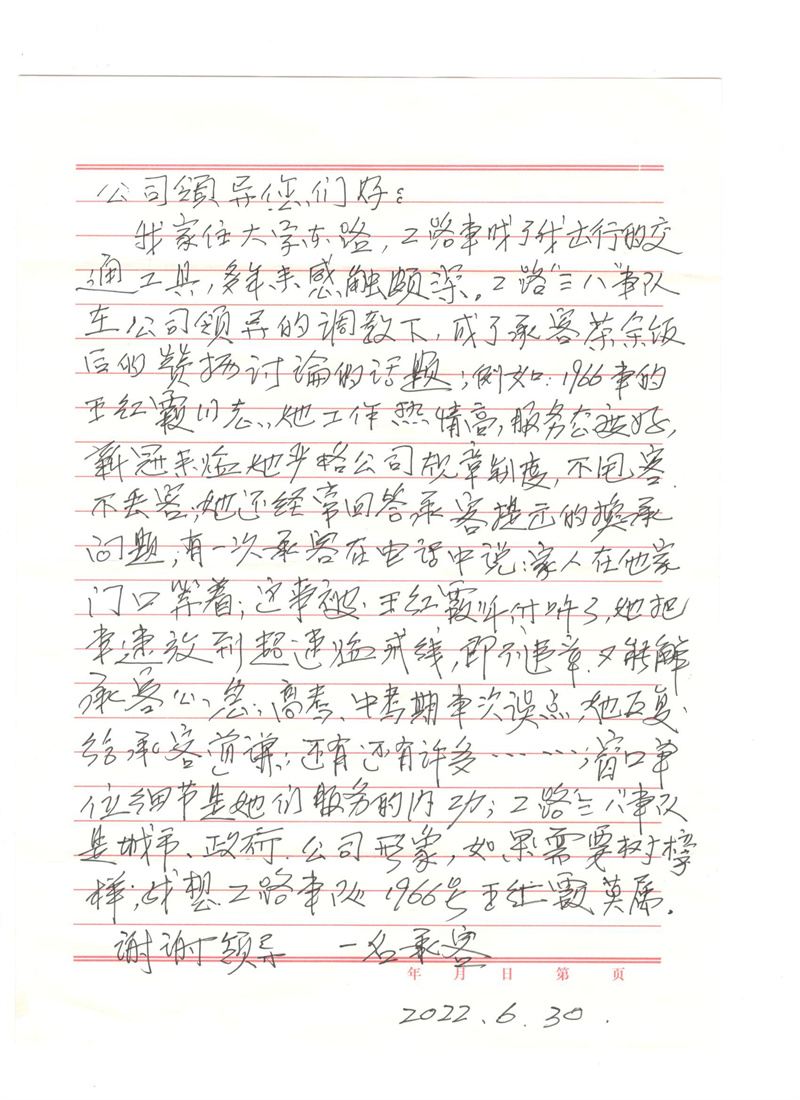 信中写道,“公司领导您们好,我家住大学东路......窗口单位细节是他们服务的内功,2路三八车队是城市、政府、公司形象”,如果需要树榜样,我想2路车队1966号王红霞莫属。”