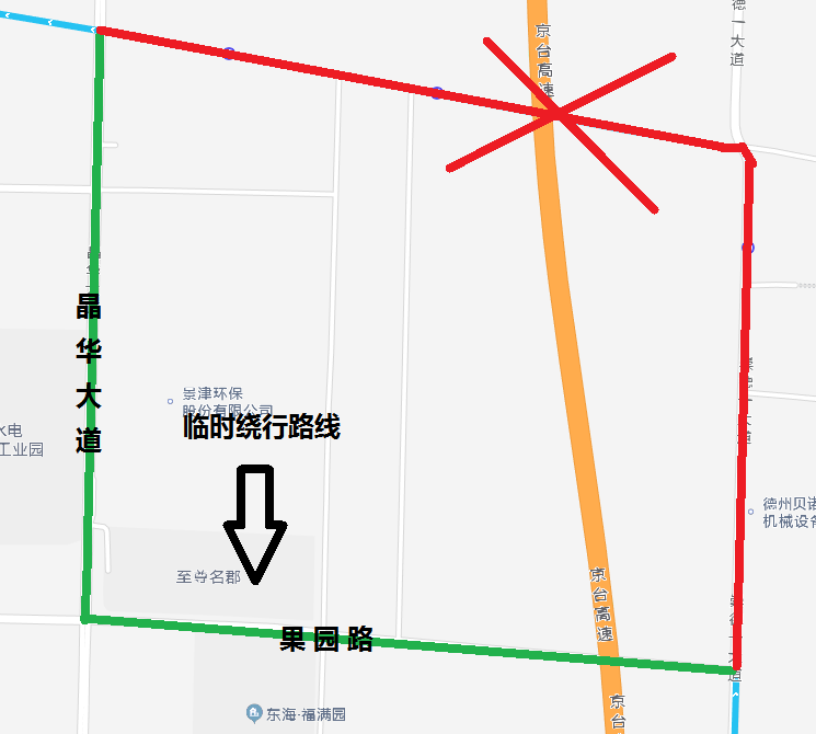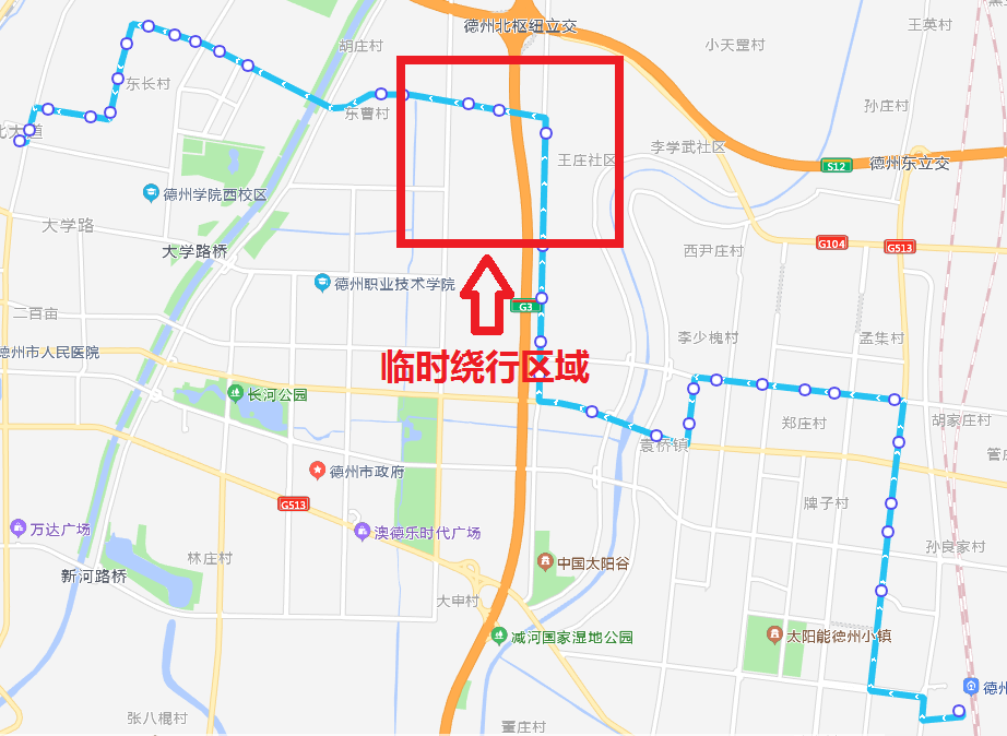113路:由德州天虹广场发车,沿原线路运行至晶华大道后向南至果园路,沿果园路运行至崇德一大道,恢复原线路运行。临时取消中通市政、红都路崂山路、王庄社区、崇德一大道果园东路4站。