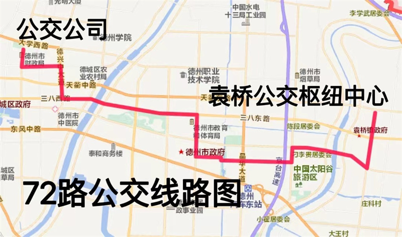 站点设置:公交公司、市财政局、青年路湖滨中大道、嘉诚名居、中心血站、德州口腔医院、市中级人民法院、九中西站、九中、鑫龙嘉园、格瑞德公寓、嘉诚尚东、蔚来城、体育中心、齐鲁银行、市体育中心、市政务服务中心东门、新城市花园、聚福园小区、湘江小区、月亮湾小区、春江明月小区、太阳谷公交枢纽、金光集团、刁李贵小区、减河湿地风景区东方红路站、崇德三大道东方红东路、市东部医疗中心、崇德三大道三八东路、袁桥社区西门、袁桥公交枢纽中心。