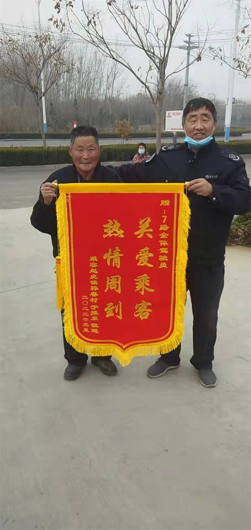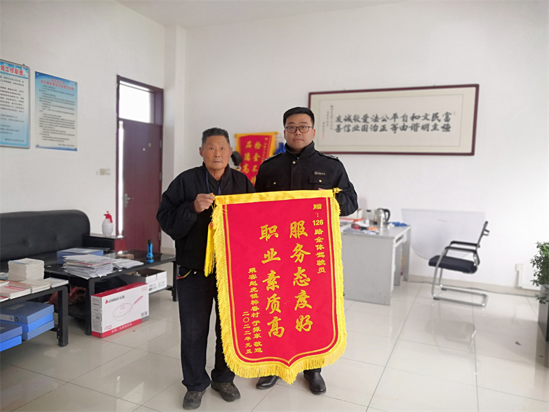 “感谢你们一直以来为我们乘客提供的安全、便捷、优质的公交服务,公交驾驶员们严谨细致的工作作风和热情贴心的服务,让我们很是感动。”12月10日,来自赵虎镇韩春村的于先生分别来到公司太阳谷公交场站和袁桥公交枢纽中心,将写有“关爱乘客 热情周到”“服务态度好 职业素质高”字样的两面锦旗送到126路和7路驾驶员手中。