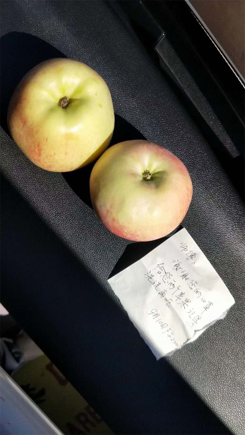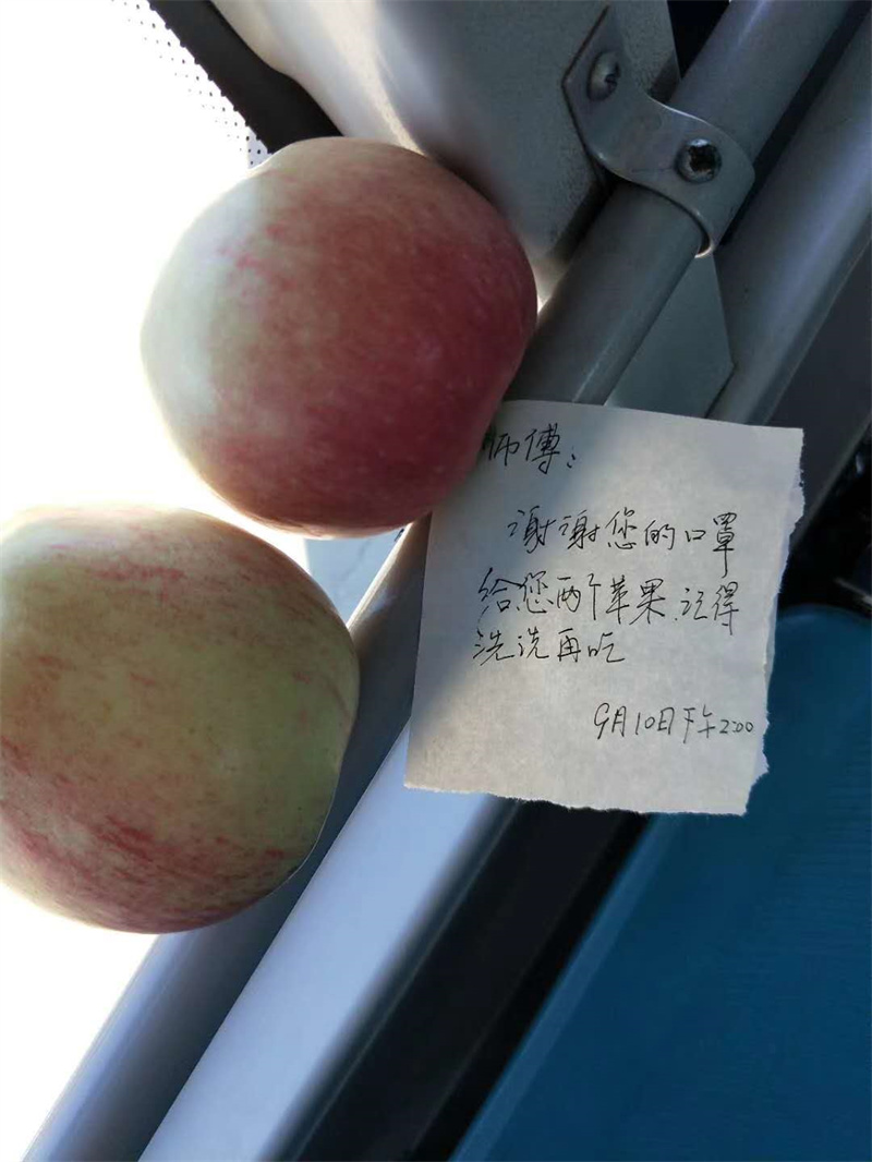 9月10日下午,112路驾驶员史学军在终点站打扫车内卫生时,发现在车厢后面窗户栏杆下放着两个苹果,苹果下还夹着一张小纸条,纸条上写着“师傅,谢谢您的口罩,给您两个苹果记得洗洗再吃”。