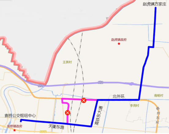 运营路线:袁桥公交枢纽中心、天衢东路、高铁东大道、北外环、博禹果蔬种植有限公司、冷庄村、李芳村、孙锢村、李明村、湾西、于彬、赵虎镇郭家庵、韩马、赵王、韩村、赵虎镇方家庄,返程亦同;