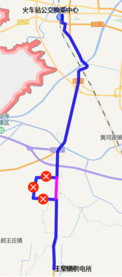 运营路线:火车站公交换乘中心、迎宾大街、东风路、向阳南路、解放大道、G105、王杲铺供电所,返程亦同。