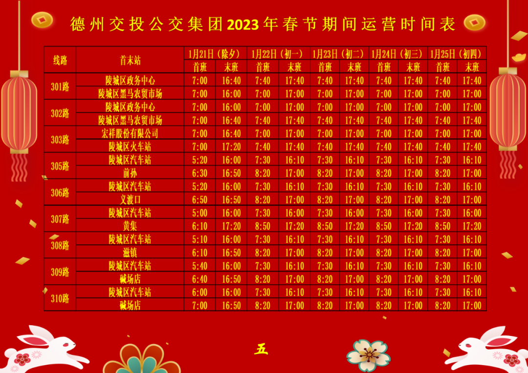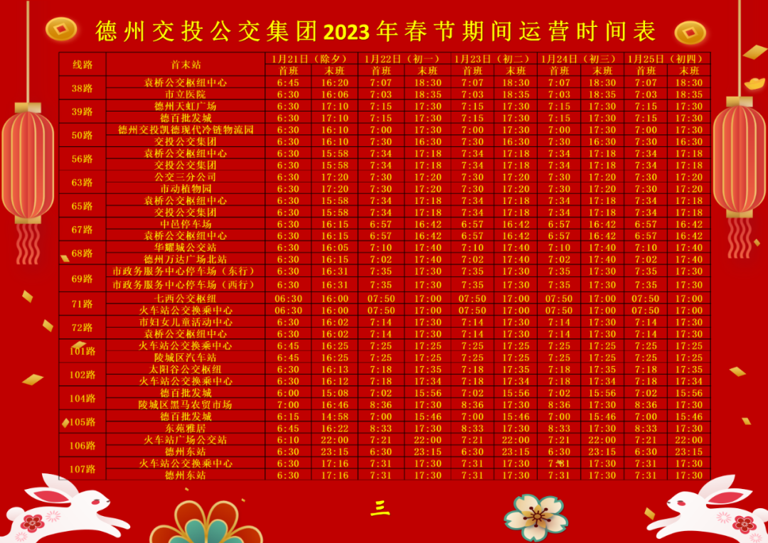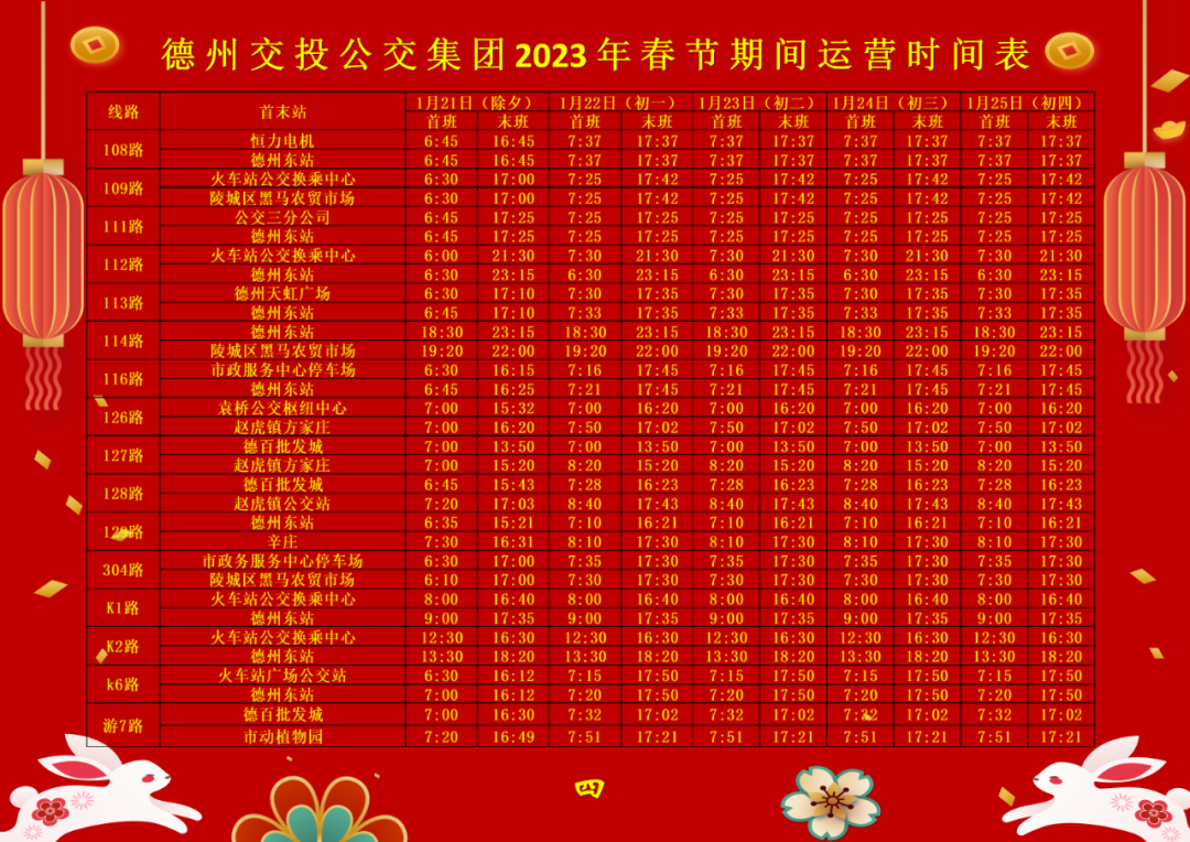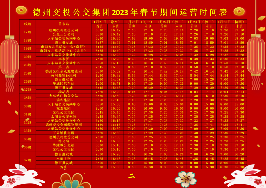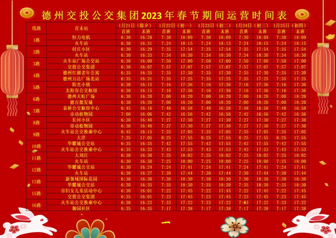 春节将至,结合居民出行情况,德州交投公交集团将于2023年1月21日(农历除夕)-1月25日(正月初四)对公交线路运营时间进行适时调整,具体如下: