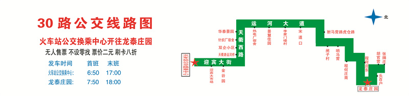 1、线路走向:火车站公交换乘中心—迎宾大街—天衢西路—运河大道—驸马营路—闸子村—程何庄—龙泰庄园—头百户—胡官营—张牌庄—龙泰庄园。