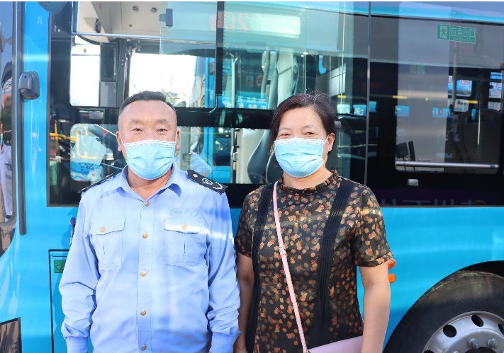 20路驾驶员周万升的妻子看到正在上班的丈夫,来到他的身边叮嘱他要注意行车安全。