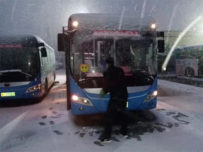 一线驾驶人员早上提前到岗,预热车辆,清扫玻璃积雪,做好车辆“三检”工作,保证车辆准时准点发车。