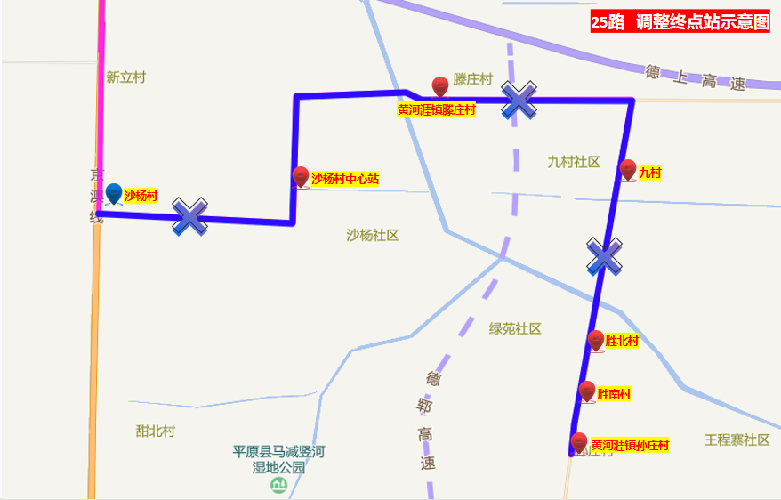 临时取消:沙杨村中心站、黄河涯镇滕庄村、九村、胜北村、胜南村、黄河涯镇孙庄村6站;无临时新增站点。